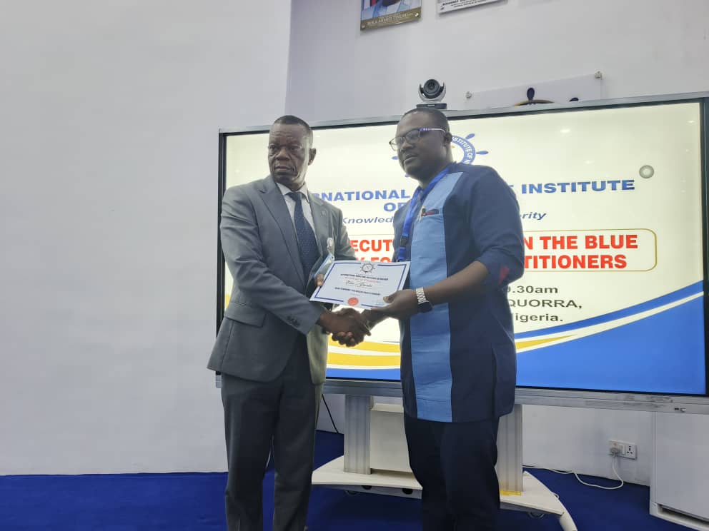 The International Maritime Institute of Nigeria(IMION), recently organized a one-day Executive course on Blue Economy for a select maritime journalists. It took place at NNS QUORRA, Western Navy Command, Lagos. The training paraded as resource persons:Barr. Mrs. Funke Agbor, SAN; Dr. Obiorah Madu; Barr. Mrs. Mfon Usoro; Rear Admiral Francis Akpan(Rtd) and of course, the Director- General of the Institute, Rear Admiral Thaddeus Udofia(Rtd) as well as many other participants from the media and the Navy formation. Participants were issued certificates of attendance.